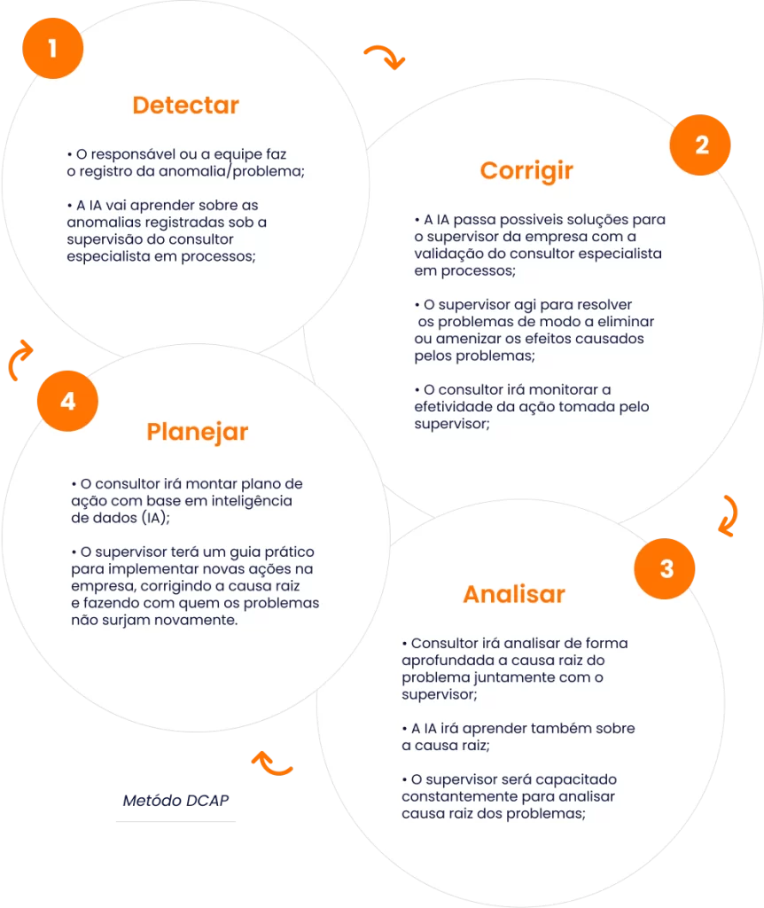 Com nossa tecnologia, o supervisor terá metas a serem atingidas para amenizar os efeitos causados pelos problemas da sua empresa. Enquanto isso, nosso time de consultores e com inteligência artificial por trás, analisa as causas para não reincidência dos problemas.